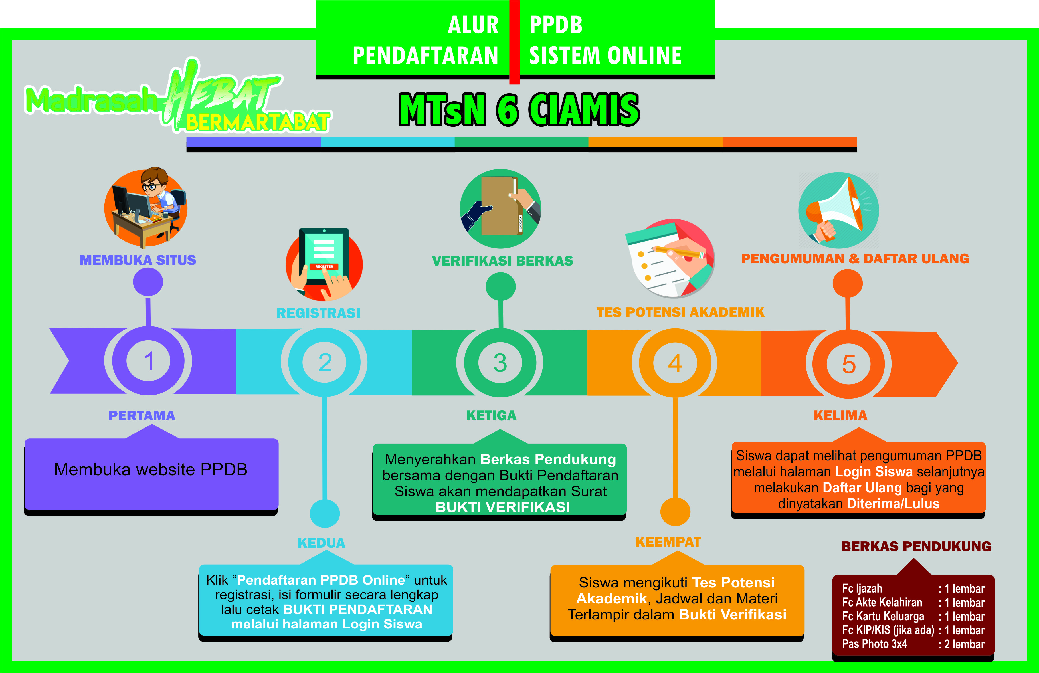 MTsN 6 CIAMIS menyediakan PPDB secara online diharapkan proses PPDB dapat berjalan cepat dan bisa dilakukan dimanapun dan kapanpun selama sesi PPDB Online dibuka. Proses pendaftaran calon siswa baru tidak menggunakan formulir konvensional hanya dengan mengakses website PPDB Online MTsN 6 CIAMIS.